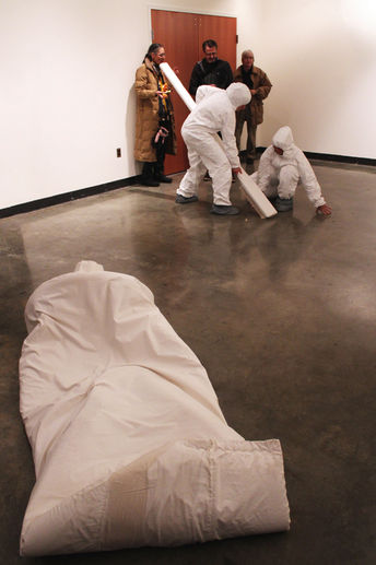 Nora Howell performs, 'Whitening' at American University in January 2013. Building on the popularity of whitening toothpaste and other oral products, Howell uses the toothpaste and brush as a metaphor to initiate a conversation about whitening as a social construct, its role in the art community, and public space.